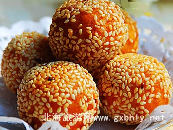 煎堆,外脆里糯,常見會有芝麻餡、綠豆餡等。這種小吃在南方很多地方都有,北海人非常喜歡吃。