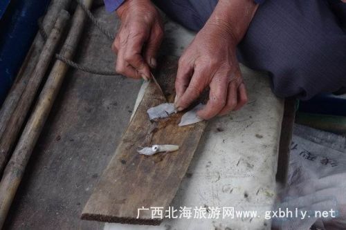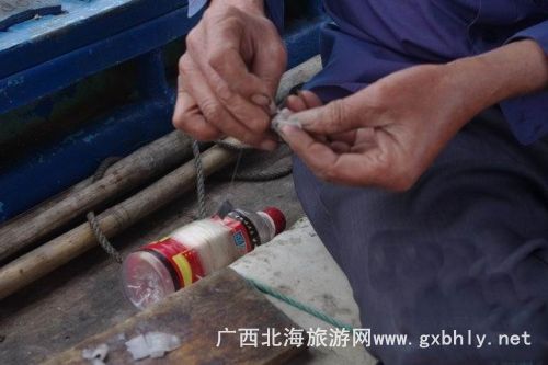 在等著魚兒撞網(wǎng)的一個小時里,我們在大叔的指導下開始了釣魚。先是用小刀將提前準備好的魷魚,切成小塊當誘餌,我們的釣魚工具很特殊,一個罐瓶子卷著釣線,漁夫告訴我們,在深海釣魚用這種辦法比較好釣,又很有手感,當?shù)氐臐O民出海釣魚都是這樣釣的。就這樣,我們的帥哥美女們就開始認真的釣了起來,因為比較生疏,就漁夫釣了幾條石頭魚。