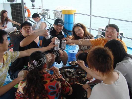 因?yàn)樘鞖馇绾,風(fēng)浪也不大,大家都上漁船到深一點(diǎn)的海里撒網(wǎng),順便來個(gè)海上自助燒烤,遺憾的是本人有點(diǎn)暈船,沒參與到多少,大部分時(shí)間趴在船內(nèi)挺尸,不過還是奉上一張其他人玩樂照給大家看看吧,其實(shí)還蠻有趣的。