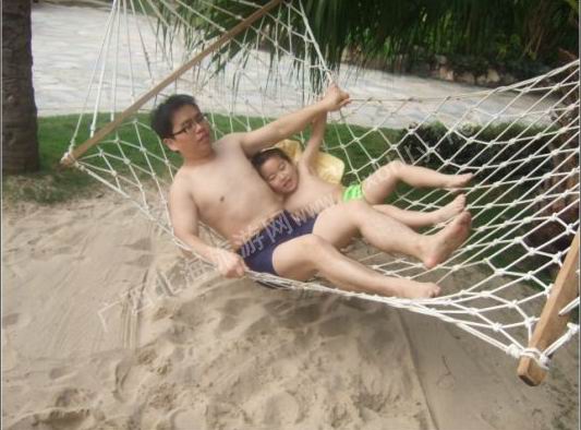 玩累了,到海邊的松樹下,掛一張網(wǎng)床,吹吹海風(fēng),真是愜意~順便來張父子泳裝合照,話說老劉你該減肥了!