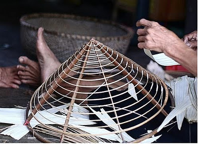 越南人制作斗笠的原料并不講究,斗笠一般使用成熟的竹子,把竹子劈開(kāi)成圓形的小小條、作為骨架、做成圓錐形,之后把他們放在燒柴廚房的廚架上面以防蟲(chóng)子,而且更加堅(jiān)韌。一般斗笠骨架做成16圈、疊成16層、有不同的半徑,并用絲線把它固定起來(lái)。附上上面一層層的是使用堅(jiān)韌的葵絲,棕櫚葉,竹葉等葉子編成,然后使用針線固定它,縫紉的針腳全憑非常均勻,毫厘不差,縫紉時(shí)必須靠著每一圈骨架縫起來(lái)。一般編成斗笠之前要選好的、比較完整的葉子、洗干凈、曬干,然后把它染成白色,編成之后再涂上一層有點(diǎn)點(diǎn)黃的斗笠專用油加以光滑并有不滲水的作用,涂上油之后那他曬干一天時(shí)間左右就可以使用,可以拿去賣了。