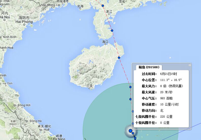 今年第8號(hào)臺(tái)風(fēng)“鯨魚”于今天(21日)上午11點(diǎn)鐘在南海中部海面上生成。逐漸向海南東部至廣東西部沿?拷,并將于22日夜間到23日白天在海南東部至廣東西部沿海登陸,預(yù)計(jì)登陸時(shí)強(qiáng)度為熱帶風(fēng)暴級(jí)(中心最大風(fēng)力8~9級(jí))臺(tái)風(fēng)將帶來(lái)較強(qiáng)降雨。