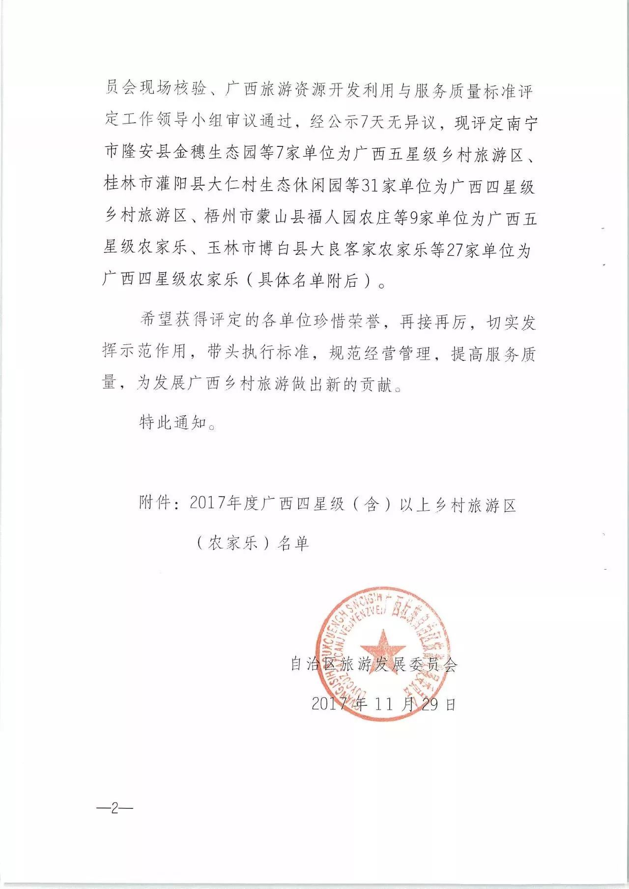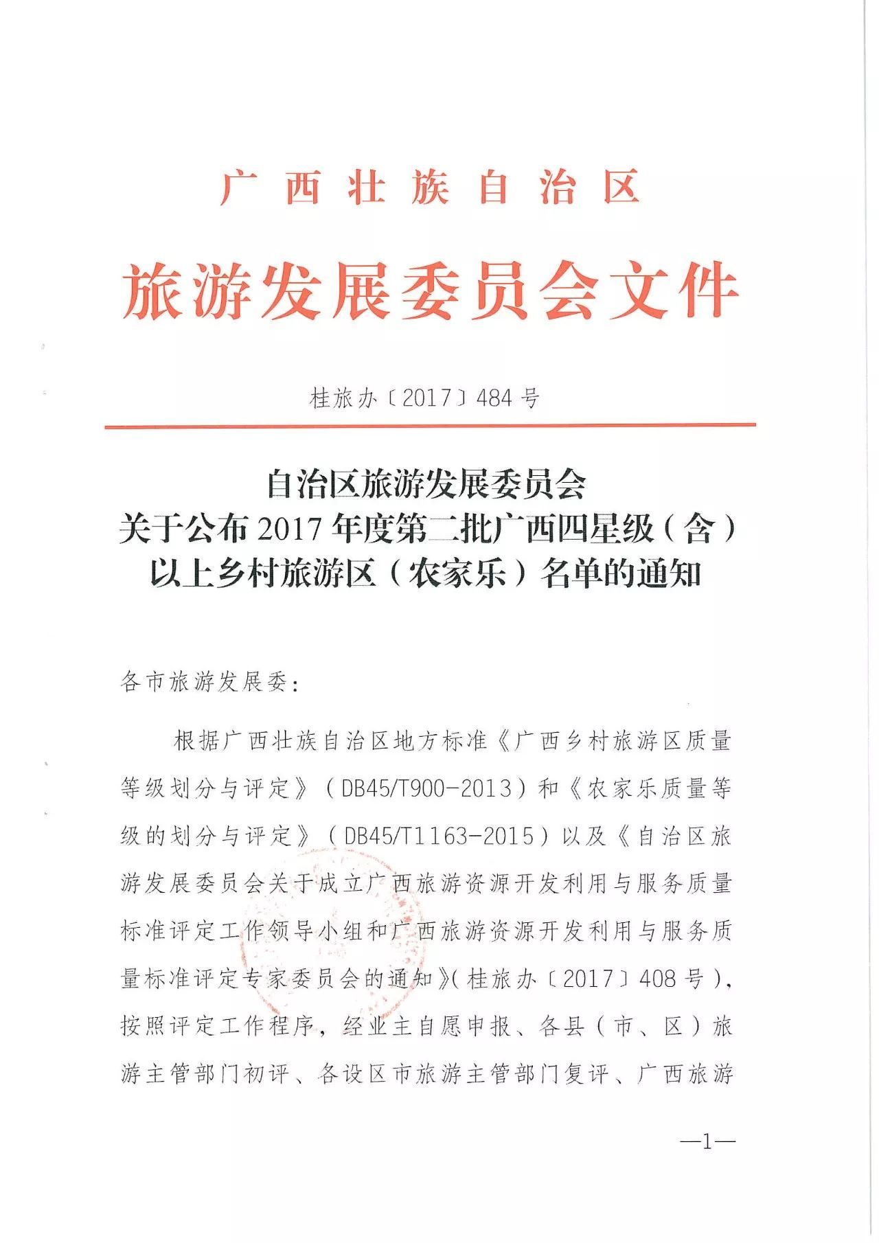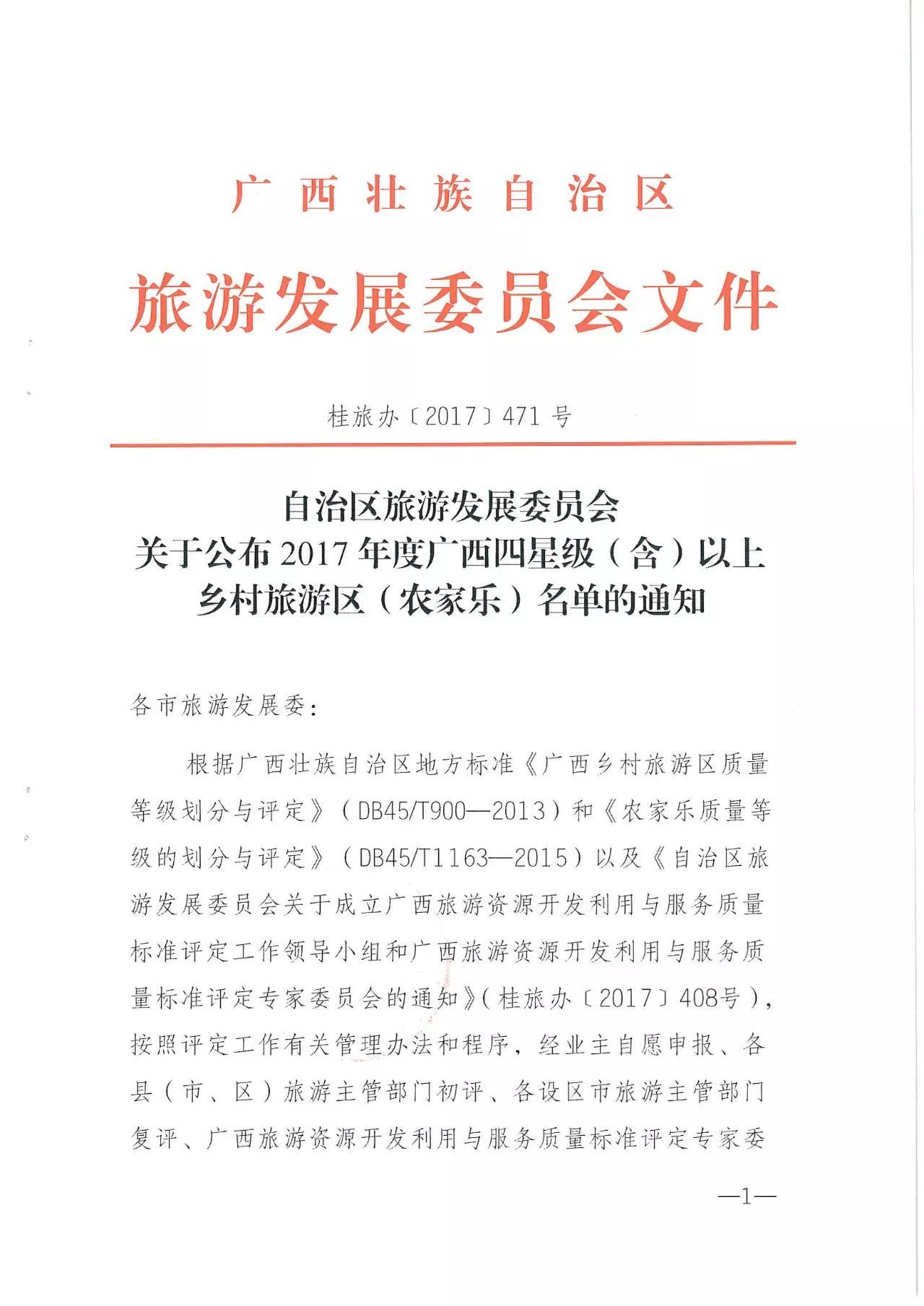 2017年度廣西四星級(含)以上鄉(xiāng)村旅游區(qū)(農(nóng)家樂)名單是根據(jù)廣西壯族自治區(qū)地方標(biāo)準(zhǔn)《廣西鄉(xiāng)村旅游區(qū)質(zhì)量等級劃分與評定》(DB45/T900—2013)和《農(nóng)家樂質(zhì)量等級的劃分與評定》(DB45/T1163—2015)以及《自治區(qū)旅游發(fā)展委員會關(guān)于成立廣西旅游資源開發(fā)利用與服務(wù)質(zhì)量標(biāo)準(zhǔn)評定專家委員會的通知》(桂旅辦〔2017〕408號),按照評定工作有關(guān)管理辦法和程序,經(jīng)業(yè)主資源申報、各縣(市、區(qū))旅游主管部門初評、各設(shè)區(qū)市旅游主管部門復(fù)評、廣西旅游資源開發(fā)利用與服務(wù)質(zhì)量標(biāo)準(zhǔn)評定專家委員會現(xiàn)場核驗、廣西旅游資源開發(fā)利用與服務(wù)質(zhì)量標(biāo)準(zhǔn)評定工作領(lǐng)導(dǎo)小組審議通過。