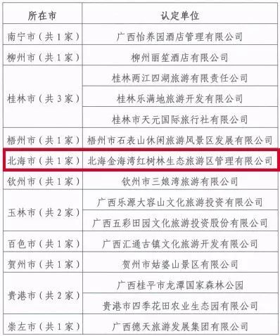 根據《廣西壯族自治區(qū)智慧旅游企業(yè)建設指引》,按照評定工作程序,經業(yè)主自愿申報、各社區(qū)市旅游發(fā)展委員會初評、廣西旅游資源規(guī)劃開發(fā)利用與服務質量標準評定專家委員會分項評分和綜合評選、廣西旅游資源規(guī)劃開發(fā)利用與服務質量標準評定工作領導小組會議審議通過,以及公示7天無異議,現(xiàn)認定北海金海灣紅樹林生態(tài)旅游區(qū)管理有限公司等15家單位為2017年度廣西智慧旅游示范企業(yè)。