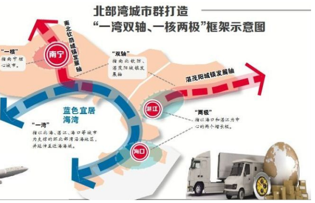 重點任務(wù) 以南寧核心城市為支撐,以北海、防城港、欽州、玉林、崇左為重要節(jié)點,構(gòu)建“一灣雙軸、一核兩極”的廣西北部灣城市群框架,促進同城化發(fā)展,輻射帶動沿海沿邊城鎮(zhèn),強化陸?臻g管控,建設(shè)宜居城市和藍色海灣城市群。