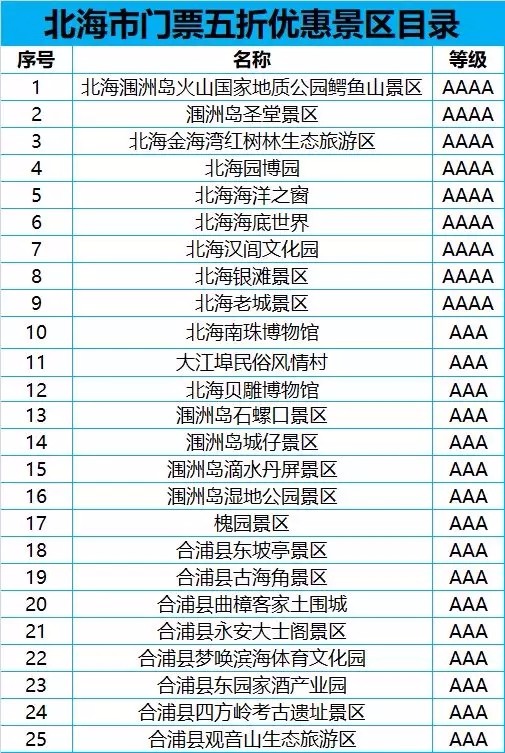 根據(jù)自治區(qū)旅發(fā)委印發(fā)的《“壯族三月三·相約游廣西”廣西文化旅游節(jié)實施方案》通知要求,全區(qū)A級景區(qū)對游客實行門票優(yōu)惠政策,北海銀灘、潿洲島、金海灣紅樹林、漢閭文化園等25家A級景區(qū)決定于2018年4月12日至2018年5月12日(4月29日至5月1日三天五一假除外)實行景區(qū)門票五折優(yōu)惠,活動結(jié)束后恢復原價。