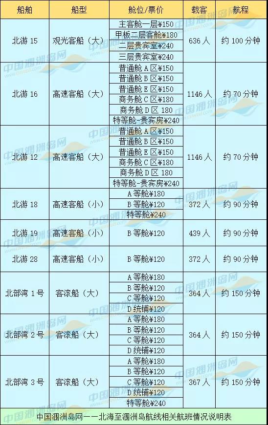 北海往返潿洲島的小快船有北游8號(hào)、北游18、北游19、北游28、飛達(dá)和飛逸1號(hào),載客量在300-400人,航行時(shí)間在60-90分鐘,也有三種艙位選擇,分別為普通艙、商務(wù)艙和特等艙。