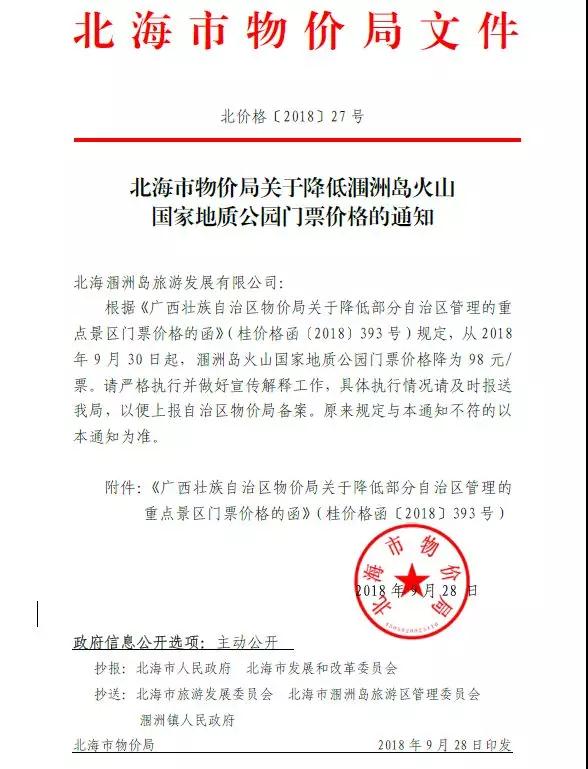 根據《廣西壯族自治區(qū)物價局關于降低部分自治區(qū)管理的重點景區(qū)門票價格的函》(桂價格函[2018]393號)文件要求,現將潿洲島火山國家地質公園門票調價有關情況通知如下: