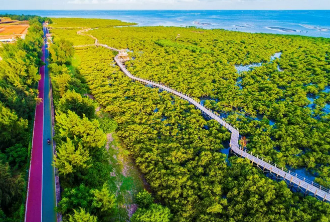 如今,一批又一批國(guó)內(nèi)外游客漫步在木棧道上欣賞紅樹林,只見葉綠映天,云浮潮間,海鳥翩翩。