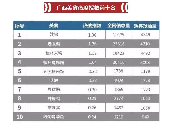 近日,新浪微輿情大數(shù)據(jù)平臺(tái)發(fā)布《2019年5月廣西旅游行業(yè)數(shù)據(jù)報(bào)告》在廣西美食熱度指數(shù)排行中北!鄙诚x“超越“老友粉”和“桂林米粉”躍居5月份排行榜之首!該榜單顯示沙蟲熱度指數(shù)為1.36全網(wǎng)信息量為11025,媒體報(bào)道量為4349均高于其他美食.