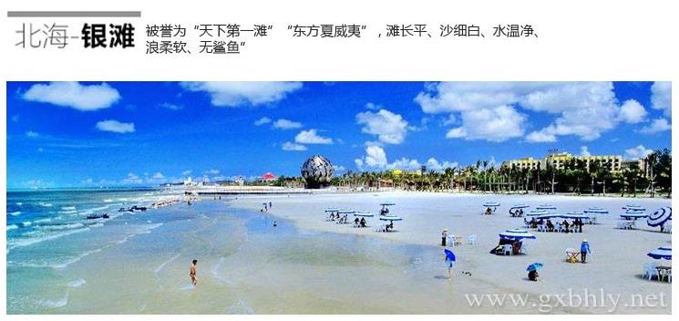 下午:游覽北海首家主題公園——大江埠風(fēng)景旅游區(qū):越南風(fēng)情村、欣賞異國風(fēng)情。自由活動(dòng)暢游天下第一灘“北海銀灘”,盡情享受陽光、海水、沙灘。 住北海(三星酒店)