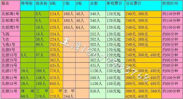 飛達(dá),飛逸1號,北游18:A等艙(位于二樓)180元/人,B等艙(位于一樓)120/人,特等艙240元/人
