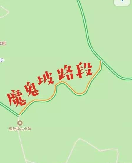 這條路因地勢兇險(xiǎn)而出名,島民都把它叫做“魔鬼坡”。(地圖上黃色和綠色的雙線就是“魔鬼坡路段”,這個(gè)路段東高西低,坡下就是潿洲中心小學(xué)。)