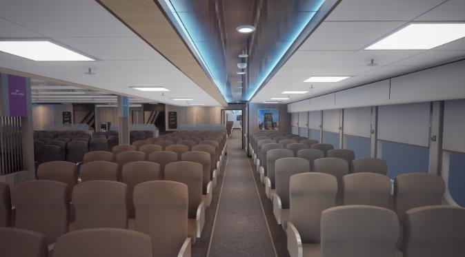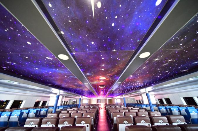 駕駛甲板設VIP間3個(24人),會議室1間,二層甲板設貴賓艙132人,商務艙294人,VIP間和貴賓艙配置按摩真皮座椅,主甲板設經(jīng)濟艙750人。