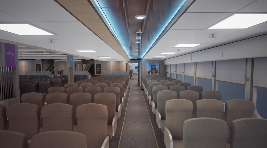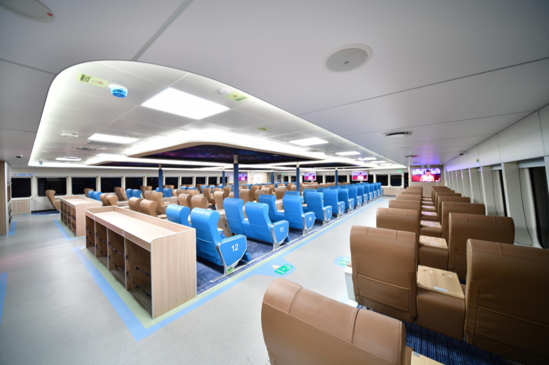 并設(shè)置殘疾人座椅、衛(wèi)生間和母嬰室,還專門設(shè)置寵物間,以方便游客帶著愛寵上島游玩。艙內(nèi)的樓梯還專門設(shè)置兒童扶手,