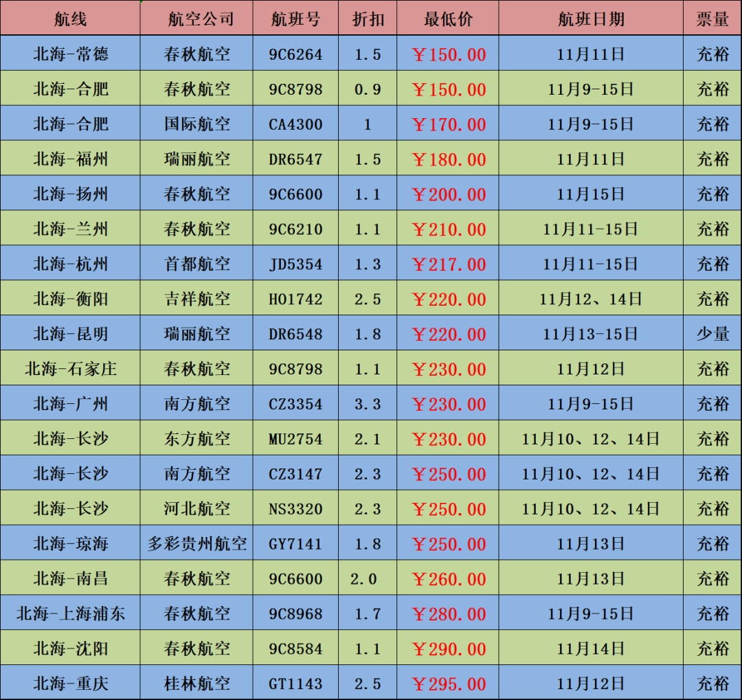 從北海始發(fā)的航班優(yōu)惠票價信息,