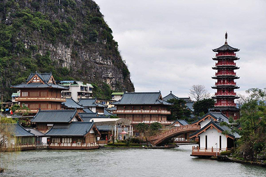環(huán)碧園:在疊彩山北白鶴洞下,與仙鶴洞相通。因"滿園碧翠,環(huán)顧可得"而名,是清代桂林畫家李秉綬所建,也叫李園;園中建筑遍布,有亭、臺(tái)、堂、榭、圃、廊10余處,成為一代名園。