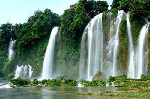 越南板約瀑布位于廣西邊陲大新縣、中越邊境交界處歸春河上游越南一方。與緊鄰的德天瀑布相連,堪稱(chēng)世界第二大跨國(guó)瀑布,僅次于美國(guó)和加拿大邊境的尼亞加拉大瀑布。瀑布上游河水時(shí)急時(shí)緩,時(shí)分時(shí)合,迂回曲折,于參天古木之間、花草掩映之下,百鳥(niǎo)鳴徊。忽遇斷崖、飛瀉而下,恰似一巨大銀練高懸于谷峽之上。站在瀑布下,水氣蒸騰,上接云漢,滾滾洪流,濤聲回蕩于山谷,聲若巨雷數(shù)里可聞。若遇晴日,彩虹飛渡,其魄力、其風(fēng)采、其氣勢(shì)震魂攝魄,搖動(dòng)心旌。