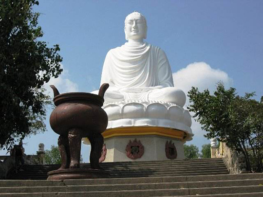 一座中國(guó)式佛寺,建筑上的龍形馬賽克是由琉璃和陶瓷瓦片裝飾而成的。這座塔寺始建于19世紀(jì),至今寺中還住著和尚。在寺后的山上,有一尊全鎮(zhèn)都看得見的巨大的石觀音雕像。從山上可以俯瞰整個(gè)芽莊市區(qū)和海濱。山下東面北面的椰林茂密。風(fēng)光自然而原始,夕陽(yáng)之下越益迷人。