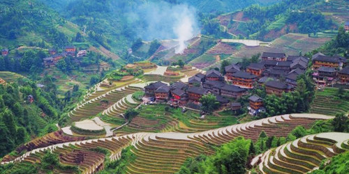 桂林龍勝縣東南部和平鄉(xiāng)境內(nèi)的龍脊山,有一個規(guī)模宏大的梯田群,如鏈似帶,從山腳盤繞到山頂,小山如螺,大山似塔,層層疊疊,高低錯落。其線條行云流水,瀟灑柔暢;其規(guī)模磅礴壯觀,氣勢恢弘,有“梯田世界之冠”的美譽,這就是龍脊梯田。