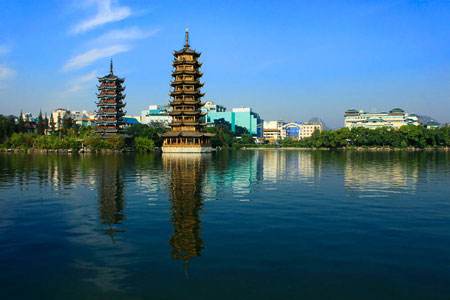 桂林日月塔又稱金塔銀塔、情侶塔;日塔別名叫金塔,月塔別名叫銀塔,所以也有金銀塔之稱。日月雙塔坐落在桂林市美麗的杉湖中,日塔為銅塔,位于湖中心,高41米,共9層,月塔為琉璃塔,高35米,共7層。兩塔之間以湖底一條10米長(zhǎng)的湖底隧道相連。
