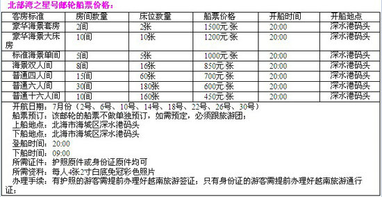 “北部灣之星”號豪華郵輪由廣西北部灣國際港務集團旗下北海郵輪碼頭公司購置,是首家國內(nèi)注冊公司自有船舶投入中越跨國海上旅游航線的大型郵輪。該郵輪總噸位9960噸,高9層,全長135米,寬20.6米,核載客量399人。行程從始發(fā)港北海出發(fā)至終點越南下龍市全程約10小時。