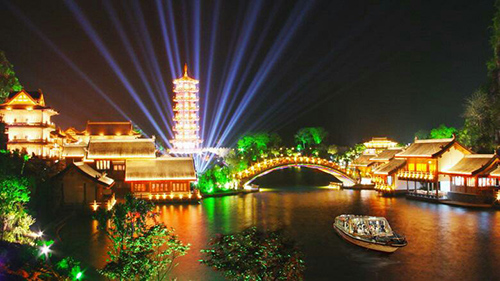 日月雙塔:座落在杉湖中,日塔為銅塔,位于湖中心,高41米,共9層,月塔為琉璃塔,高35米,共7層。