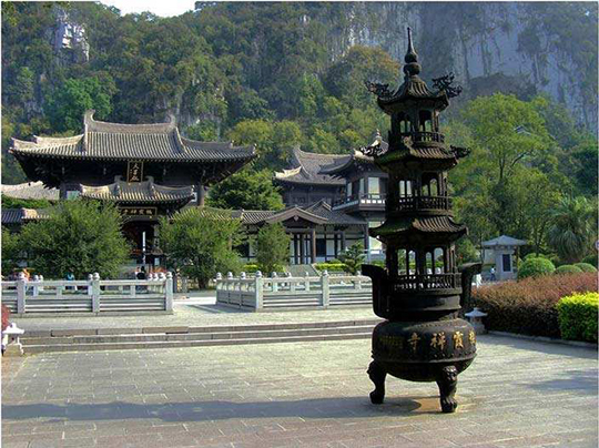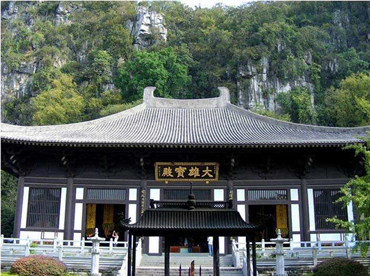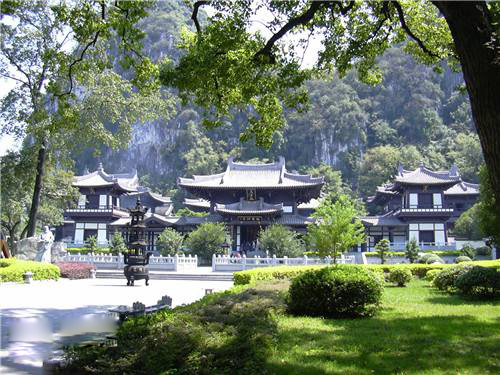桂林棲霞寺位于桂林七星景區(qū)北門處,為中國目前最大保存最完整的一所唐式風格寺廟,至今一千多年歷史。觀音殿供奉的觀音為鎮(zhèn)寺之寶,原料采用四川雅安漢白玉于2002年雕刻而成,高6.8米,重18噸。是兩湖兩廣一帶最重最高的一尊觀音。